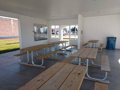 The picnic pavilion on the right (inspired by an old service station) and "train station," (left) alongside a memorial to local service men & women, Strafford, MO. |
